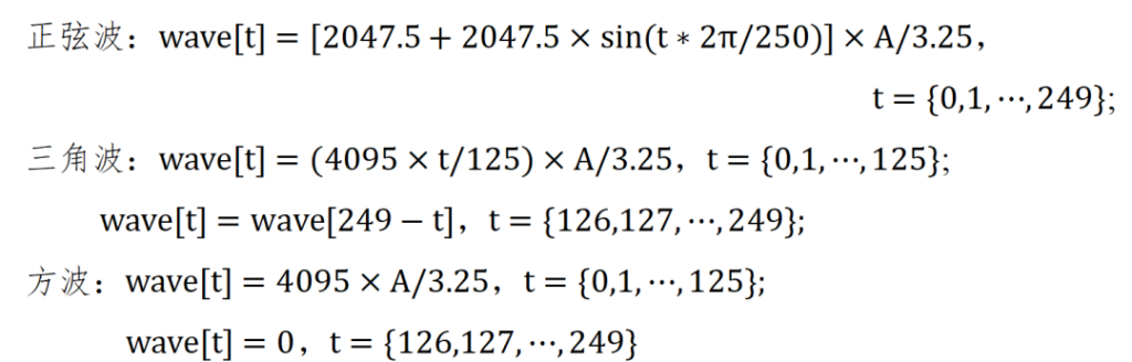 波形函数的作用是根据传入的参数计算各波形的两个周期的数据,通过DMA传输给DAC进行数模转换。