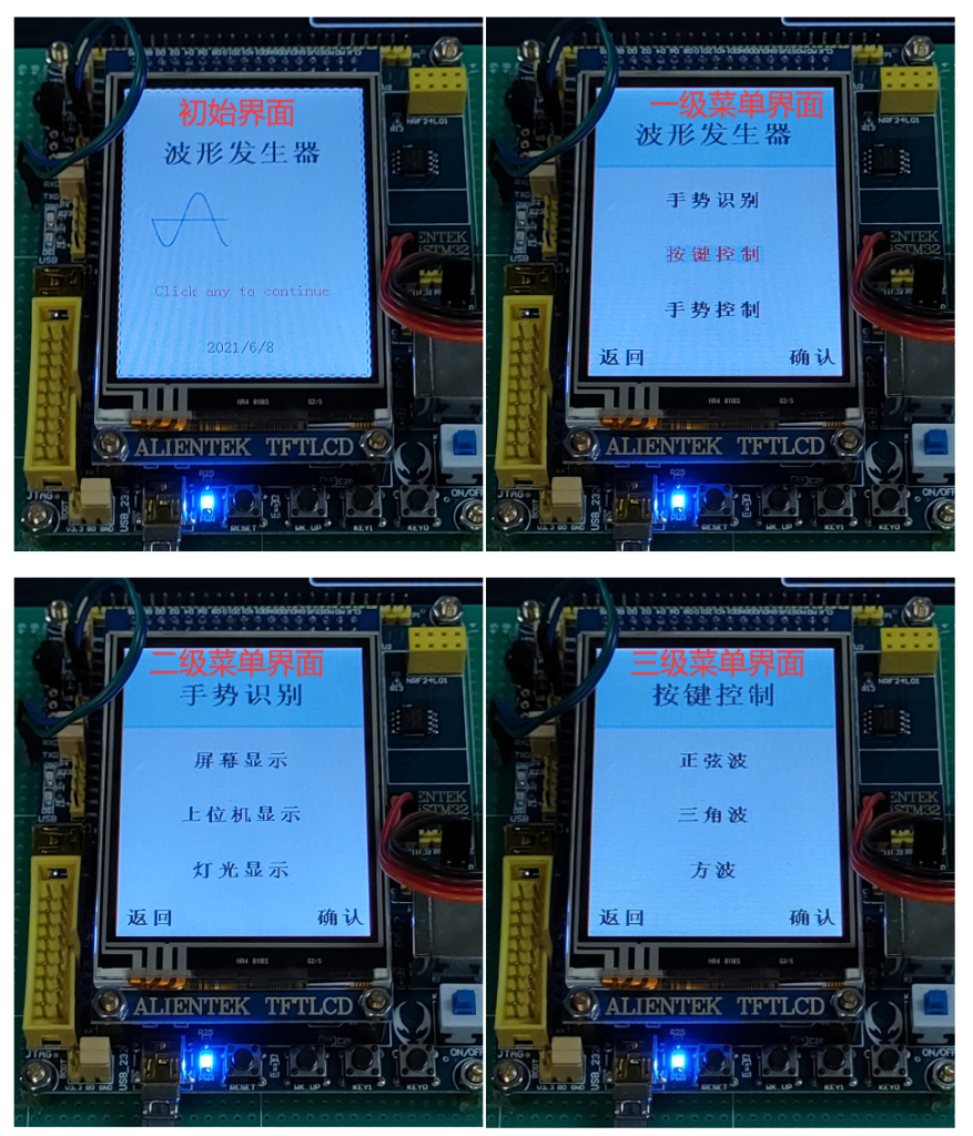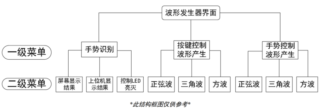 (1)  进入一级菜单后,在屏幕上至少显示 3 栏以上信息:手势识别结果、按键产 生波形、手势产生波形,对功能进行选择时,左侧需要有明显的光标(可用 符号*代替光标);