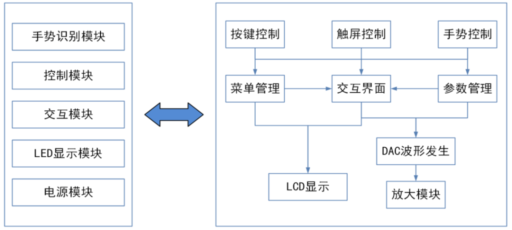 系统包括LCD显示屏模块、ATK-PAJ7620手势识别模块、放大模块、电源模块、交互模块、控制模块。通过上述六大模块实现正弦波、三角波、方波的产生与控制。