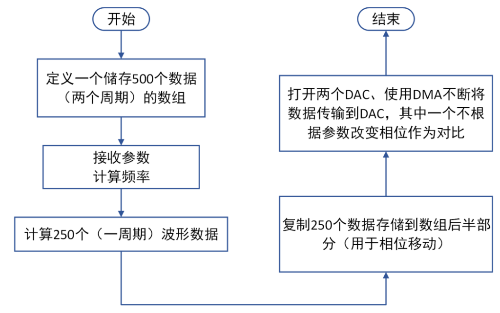 调用此函数时需要传递相应参数,函数会计算出两个周期的数据点,然后经过DMA将数据快速传入DAC,从而可输出不间断的波形。