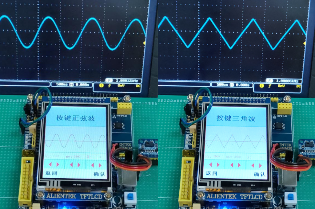 (3)  完成一级菜单下的按键控制波形产生功能;在二级菜单下,结合 STM32 内 置 DAC,完成波形产生功能(三角波、正弦波、方波),并通过按键可以 调整波形参数(频率、幅值、相位)