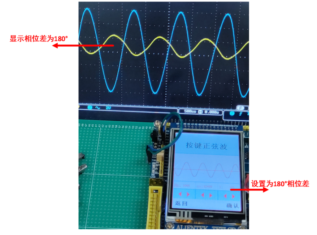 未解决上述问题,系统打开两个DAC通道,同时输出波形,两波形参数一直,但相位不同。对比波形相位不会改变,另一波形相位跟随参数的变换而变化从而解决了相位改变无法观测问题。