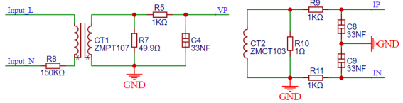 电压系数:根据以上电路图中左侧电压采集电路,电流型电压互感器一次侧为R8=150k电阻,则一次侧电流为Vin/R8,二次侧电流等于一次侧电流,VP = Vin/R8 × R7;故电压系数 = Vin/(Vp * 100) = R8/(R7 * 1000) = 3.006